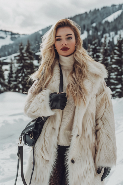 What I love about this look is how unapologetically bold and stylish it feels. The faux fur coat makes a dramatic statement, perfect for those snowy mountain photos, while the cream and black palette keeps it timeless and easy to pull off. The leather gloves are such a chic touch—they add a little “winter femme fatale” vibe, don’t you think? This outfit is for the woman who wants to own the snow in style. It’s glamorous, cozy, and absolutely unforgettable.
