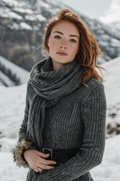 This outfit showcases the elegance of monochrome styling, featuring a stunning gray cable-knit sweater dress that hugs the body while keeping it cozy. A wide black belt cinches the waist, adding definition and a touch of sophistication. The matching gray knit scarf draped effortlessly around the neck enhances the layered look, while the fur-trimmed cuff detail adds a subtle hint of luxury. This ensemble is perfect for those crisp mountain days when you want to stay warm yet look refined.