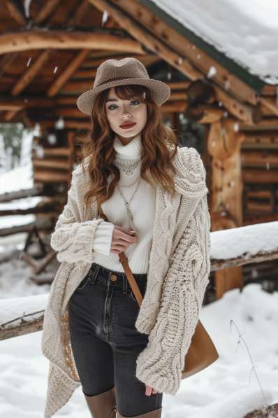 What I love about this outfit is how effortlessly cozy yet put-together it feels. The cardigan gives off serious “snuggle me” vibes, while the hat and jewelry add just the right amount of boho flair. It’s perfect for a winter cabin getaway or strolling through a snowy village—you’ll feel warm and stylish, like you belong in a postcard. It’s the kind of look that’s as Instagram-worthy as it is comfortable. Who wouldn’t want to rock this vibe?