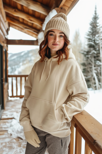 This outfit is all about keeping it simple, comfy, and oh-so-stylish. A relaxed cream hoodie sets the tone for ultimate coziness, paired with soft gray joggers for that perfect cabin-chill vibe. The chunky knit beanie in a matching neutral tone and the cozy gloves are ideal for braving the porch or sipping coffee while watching the snow fall.