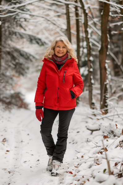 What I love most about this outfit is how it mixes practicality with personality. That pop of red is just the thing to brighten up a gray winter day and makes the wearer look confident and full of energy. The combination of warm layers and functional footwear makes it perfect for winter trails while still feeling chic. Honestly, it’s like a wearable confidence boost—can’t you just feel the “let’s conquer the day” energy? So inspiring!