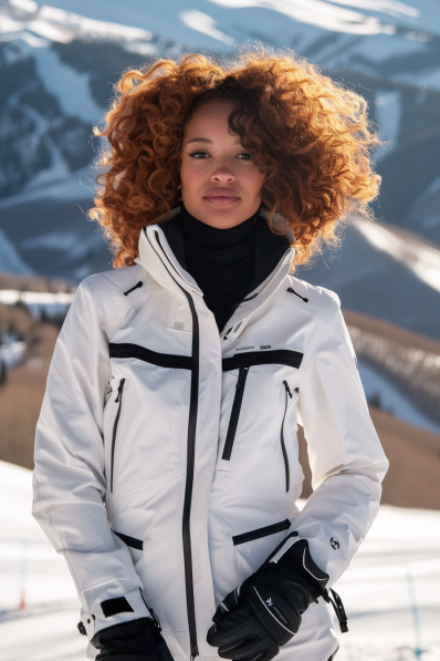 This outfit is a showstopper with its striking red jacket that immediately grabs attention against the snowy backdrop. The jacket is both functional and stylish, with zippered pockets and a cozy hood perfect for outdoor adventures. Paired with fitted black snow pants and sturdy white boots, this look is ready for everything from a snowy hike to a cheerful stroll. The addition of a coordinating scarf and red gloves ties the outfit together seamlessly, creating a polished, vibrant vibe.