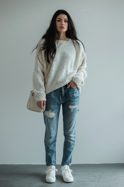 Honestly, I’m obsessed with how comfortable this outfit looks without sacrificing style. The loose sweater feels like a warm hug on a breezy zoo day, and the ripped jeans add just the right amount of edge to make it fun. Plus, those white sneakers are a smart move—they’ll keep your feet comfy when you’re walking all day, but they also give the look a fresh, clean vibe. This is definitely a go-to outfit for when you want to look laid-back yet stylish!