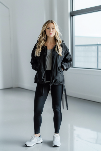 This outfit is the definition of chic athleisure! A lightweight black windbreaker jacket pairs perfectly with sleek black leggings, creating a streamlined and sporty look that’s ideal for a busy day at the zoo. Underneath, a simple gray tank adds a touch of contrast and keeps the outfit feeling breathable. White sneakers complete the look, making it functional for lots of walking while also adding a fresh pop to the all-black ensemble.
