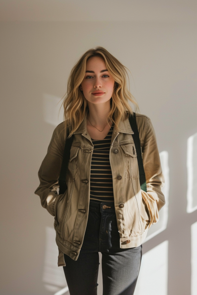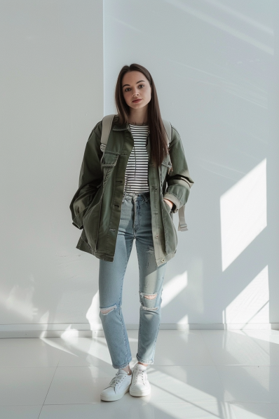 What I love most about this outfit is how it blends casual pieces with a bit of that utilitarian edge. The olive jacket is super versatile and perfect for when the weather is a little unpredictable, and the stripes on the tee add just the right amount of pattern without being overwhelming. Those distressed jeans keep things laid-back, while the white sneakers add that final touch of crispness. This is one of those outfits you can count on for an easygoing day out, and you’ll still look like you have your style game totally figured out!