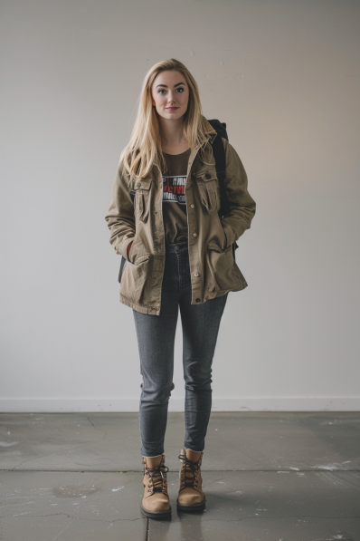 This outfit is all about being stylishly prepared for a day of exploration! The vintage-style graphic tee adds a touch of personality and laid-back charm, while the tan utility jacket keeps things practical and on-trend. Fitted dark jeans create a flattering silhouette and give the look a bit of polish. And let’s talk about those tan lace-up boots—they’re perfect for adding a hint of adventure to the ensemble, making sure you’re ready for anything the day throws your way. A black backpack finishes off the look, keeping your essentials close at hand.