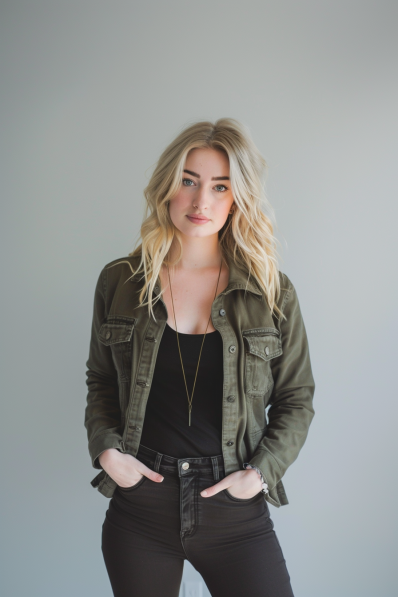 This outfit showcases how simplicity can be effortlessly chic! The olive-green military jacket pairs beautifully with an all-black ensemble underneath, creating a look that’s sleek and timeless. The fitted black top and matching black jeans elongate the silhouette, while the jacket adds a pop of earthy tone to keep things visually interesting. A long, delicate necklace brings just the right amount of elegance to the whole outfit without overdoing it.