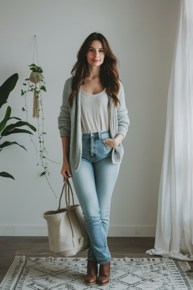 This outfit is the definition of light and cozy chic! The soft gray cardigan draped over a simple white tank top creates a look that’s laid-back yet polished. Light-wash high-waisted jeans bring a classic, flattering fit, while the brown ankle boots add a touch of rustic charm. A large woven tote bag completes the look, adding a hint of boho flair that’s perfect for a casual zoo day. This combination is all about comfort and style rolled into one easygoing ensemble.