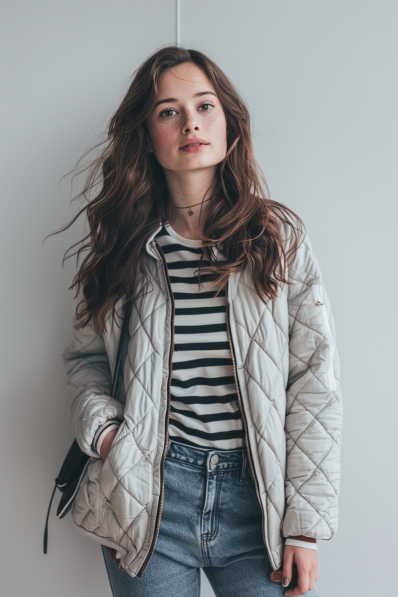 I’m really loving how cozy yet cool this outfit feels. The quilted jacket is a classic, but the light gray color keeps it feeling fresh and contemporary. Stripes are always a win in my book—they add visual interest without going overboard. And the high-waisted jeans just bring everything together, creating a flattering silhouette while being super comfortable. This is the kind of outfit you’ll want to wear all day because it’s cute, practical, and feels like you’ve got that effortless style nailed!