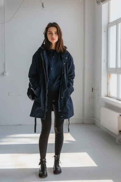 This outfit is the perfect combination of practical and effortlessly stylish! The long, navy parka is the ultimate layering piece for a cool day at the zoo, offering warmth without sacrificing style. Paired with a matching navy hoodie, it creates a seamless, monochrome look that feels both sleek and cozy. Black leggings keep the outfit streamlined and comfortable, and the lace-up combat boots add a touch of edgy flair, giving the entire ensemble a bit of attitude.