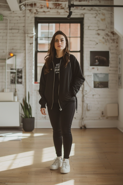This outfit is all about embracing sleek, minimalist street style! An oversized black zip-up hoodie paired with black skinny jeans creates a monochromatic look that’s effortlessly cool. The black graphic tee underneath adds just the right amount of attitude without overpowering the outfit. And those white sneakers? They’re the perfect contrast to the all-black ensemble, giving it a fresh and clean vibe while keeping things casual and comfortable for a day on your feet.