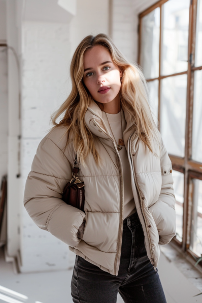 When the temperature drops but the zoo plans are still on, this puffer jacket outfit is just what you need! The cream-colored puffer is both stylish and cozy, giving off major “effortlessly chic” vibes. Underneath, a neutral-toned turtleneck keeps things simple and warm, while the dark skinny jeans add contrast and structure to the look. A small, sleek handbag completes the ensemble, bringing a touch of sophistication to this otherwise laid-back outfit. It’s the perfect mix of comfort and style, ensuring you stay warm while looking fab.