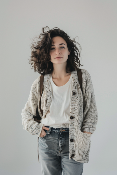 This outfit is all about keeping it cozy while staying effortlessly stylish. The oversized, chunky knit cardigan is the star of the show, adding a relaxed and comfy vibe that’s perfect for an outdoor adventure at the zoo. Paired with a simple white tee and light-wash, loose-fitting jeans, this look is laid-back and practical, yet still totally cute. The neutral tones of the cardigan and tee give it an earthy feel, while the jeans keep it casual and easygoing. A backpack is the perfect accessory, making it functional for a day of exploring!