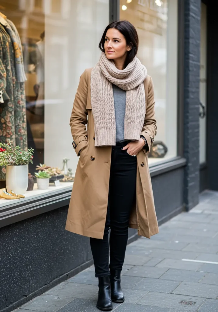 This outfit brings classic fall layers to life. A tan trench coat pairs beautifully with a chunky beige scarf, a simple gray sweater, and slim black pants tucked into ankle boots. It’s that perfect balance of cozy and structured, ideal for those crisp November afternoons before dinner starts.