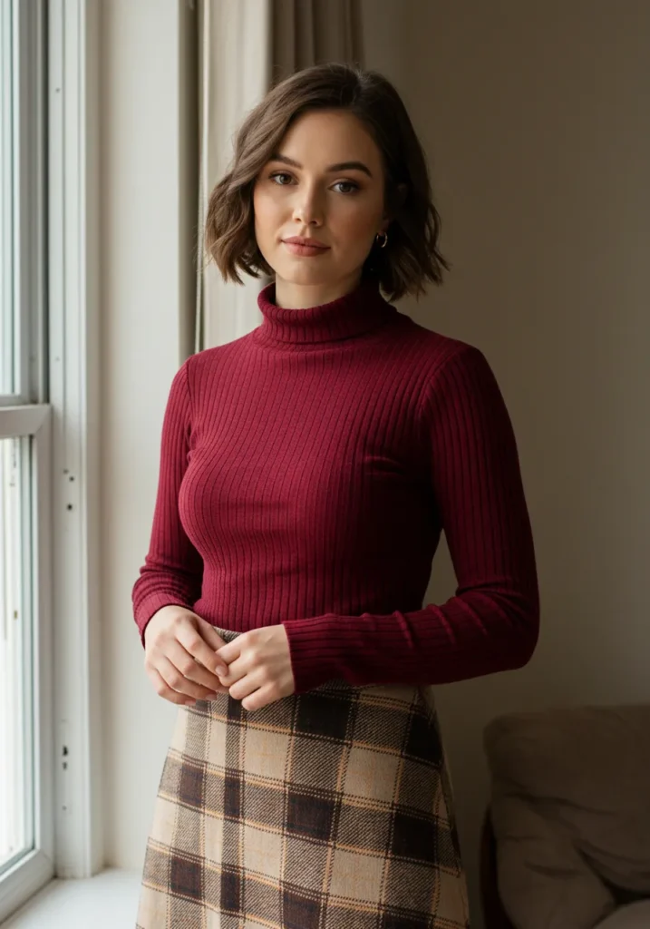 This look is pure Thanksgiving charm. A ribbed burgundy turtleneck tucked into a high-waisted plaid skirt gives all the cozy, vintage-inspired vibes. The colors complement each other beautifully, blending rich fall tones with classic patterns that never go out of style. It’s the perfect mix of ladylike and relaxed, especially for a family gathering or friendsgiving dinner.