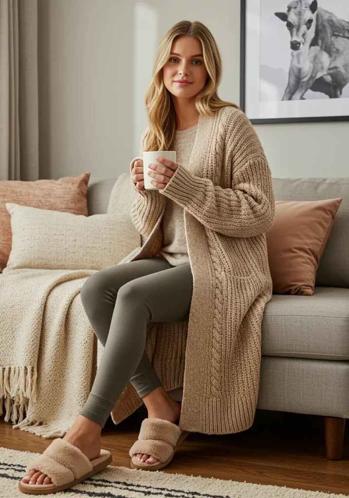This outfit is basically a warm hug in clothing form. An oversized cable-knit cardigan layered over a soft beige sweater and comfy olive leggings creates the ultimate at-home Thanksgiving vibe. Add the plush fuzzy slippers and suddenly lounging on the couch with a mug of coffee feels like a whole aesthetic.