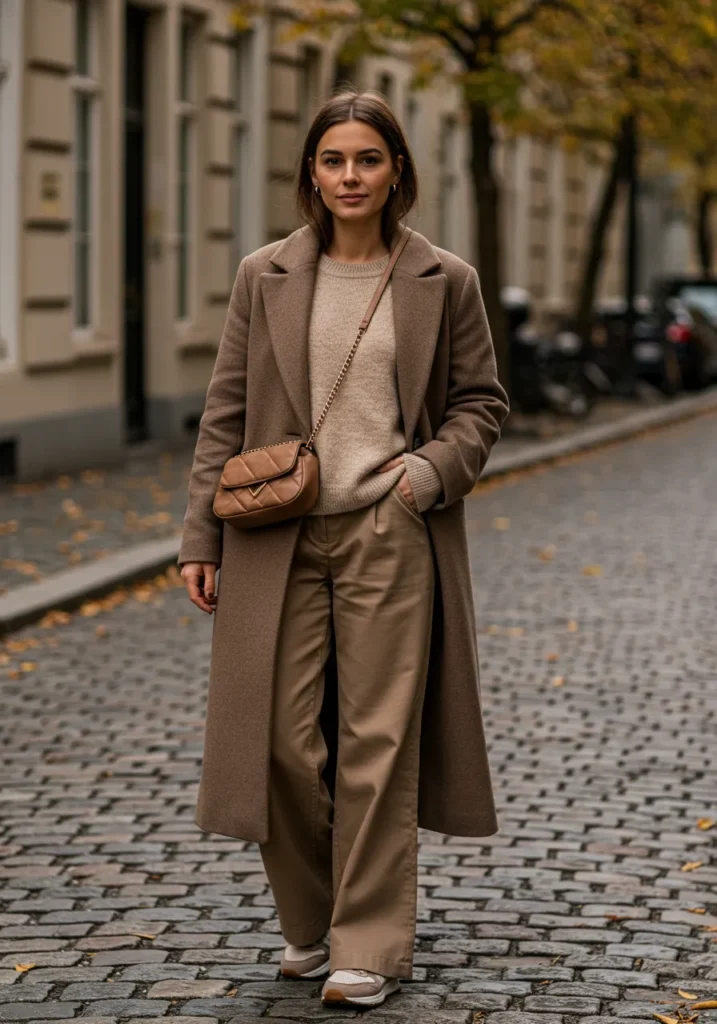 This look is all about understated elegance. The long taupe coat layered over a beige knit and paired with wide-leg trousers in matching tones feels effortlessly put-together. The crossbody bag and sneakers add that modern, practical twist, making it ideal for running errands before dinner or strolling through the city on a crisp November morning.