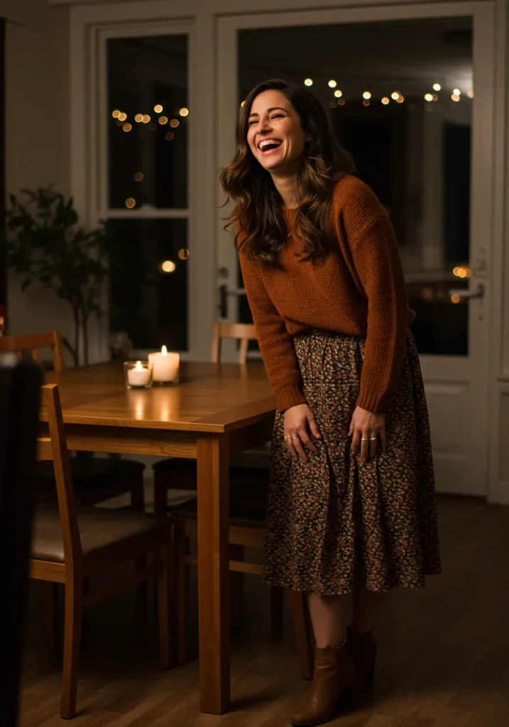 This one captures that joyful, cozy energy of Thanksgiving night. A rich rust-colored sweater tucked into a flowy floral midi skirt feels cheerful and romantic, especially paired with heeled ankle boots. The warm tones echo candlelight and golden pie crusts — basically everything we love about fall wrapped into one look.