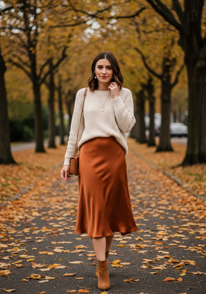 This outfit is the definition of effortless elegance. A cream ribbed sweater tucked into a silky copper midi skirt instantly feels polished yet cozy. Add ankle boots and a crossbody bag in matching warm tones, and you’ve got the perfect look for a chic Thanksgiving dinner or an evening out.