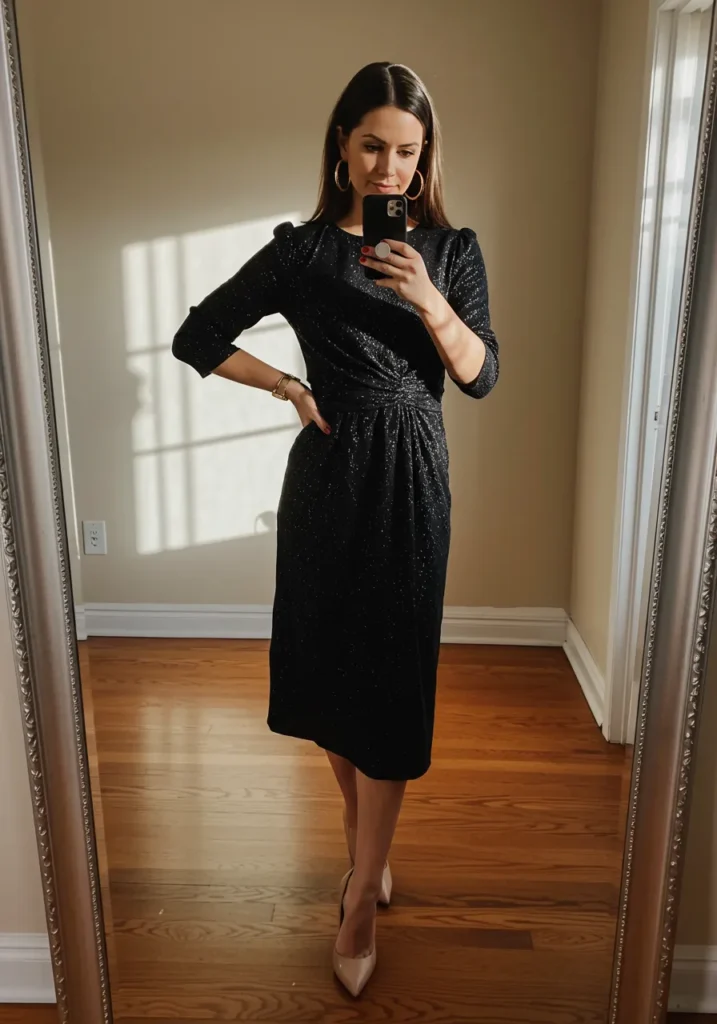 This outfit features a black, shimmer-threaded midi dress with a fitted waist and softly gathered detail. Three-quarter sleeves and a modest neckline keep it polished, while nude pointed heels elongate the legs for a graceful finish. The fabric catches light in the prettiest way, giving it just enough festive charm without feeling over the top.