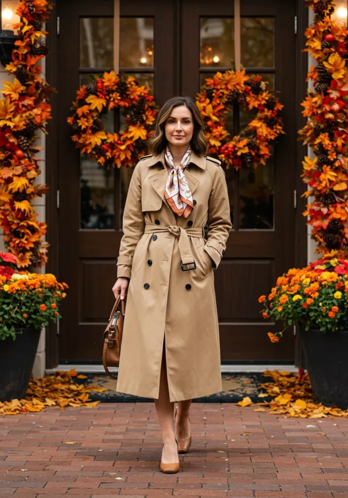 This chic fall look features a beige trench coat tied neatly at the waist, paired with tan heels and a printed silk scarf around the neck. The warm tones and crisp lines make it look effortlessly refined.