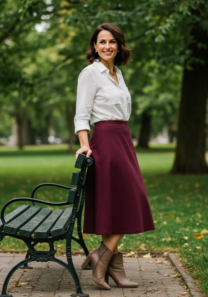 This outfit pairs a crisp white blouse with a deep burgundy midi skirt, finished with sleek taupe ankle boots. The simple mix of structured and soft fabrics creates an effortlessly put-together look that feels both feminine and smart.