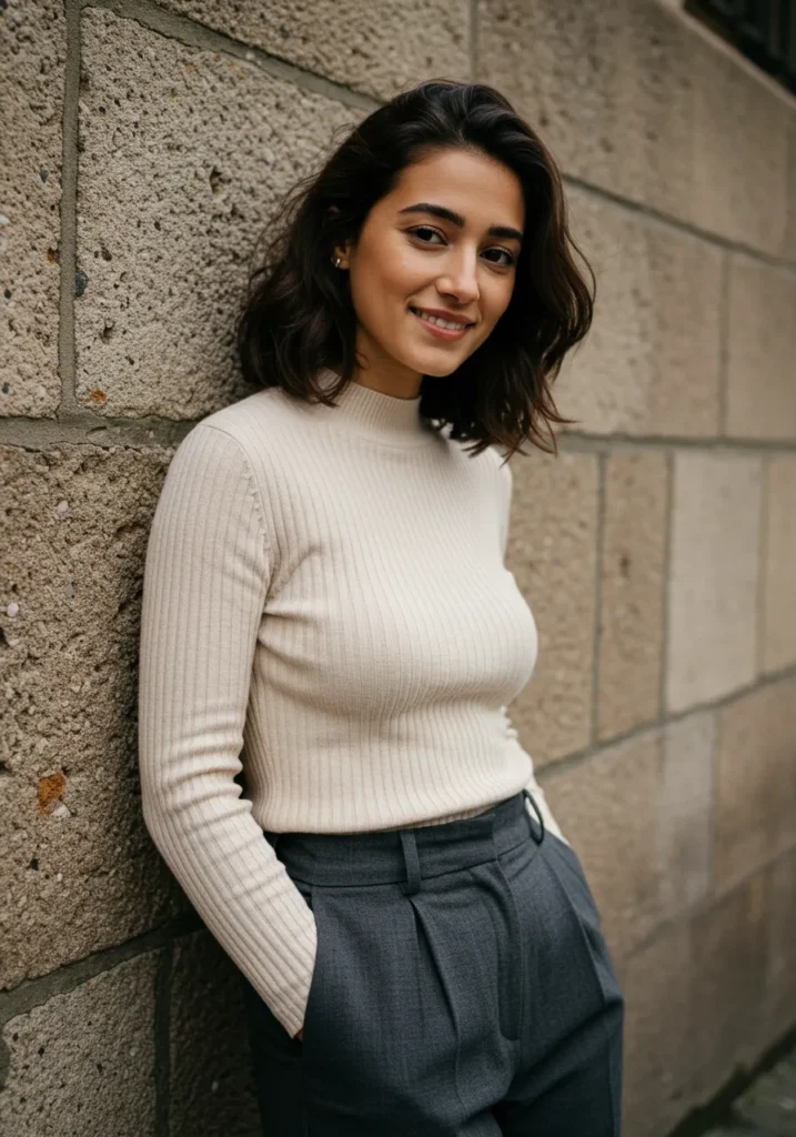 This classic look features a fitted ribbed cream sweater tucked into high-waisted charcoal gray trousers. The soft texture of the knit balances the tailored pants beautifully, giving the whole outfit a timeless, minimal vibe.