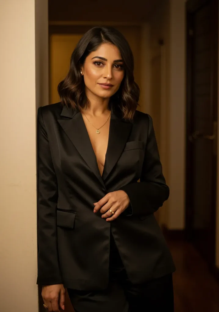 This outfit radiates quiet confidence with a black satin blazer paired with matching tailored pants. The glossy finish of the fabric gives it that touch of luxury, while the open neckline keeps it modern and feminine.