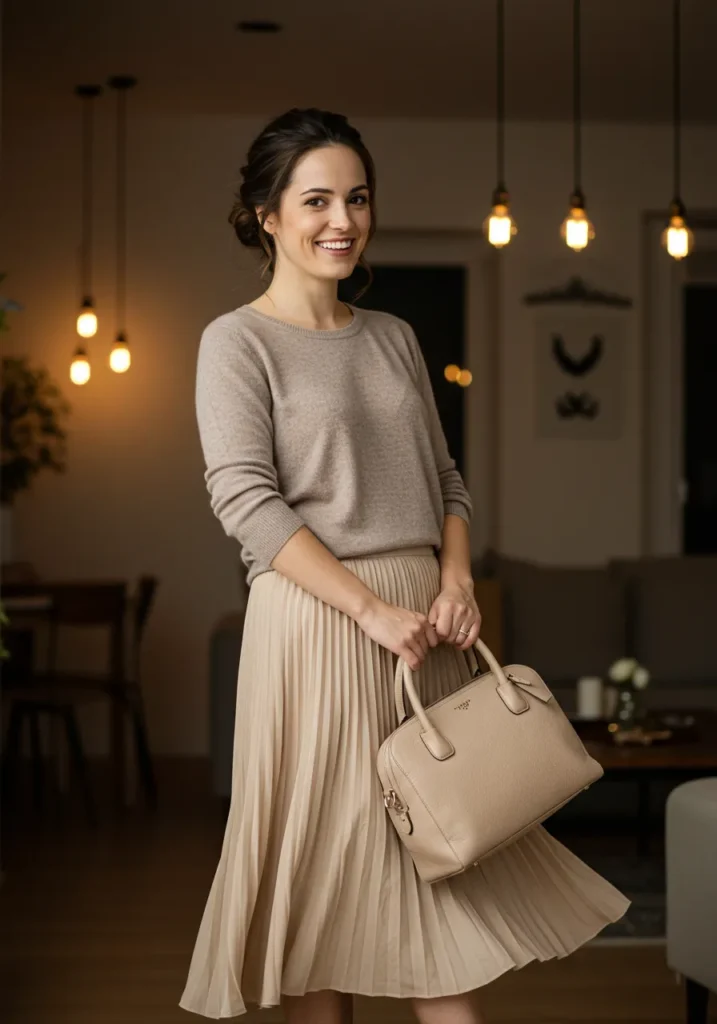 This elegant look brings together a soft taupe sweater with a matching pleated midi skirt and a structured beige handbag. The monochrome palette gives it a refined, graceful appearance that feels calm and cozy.