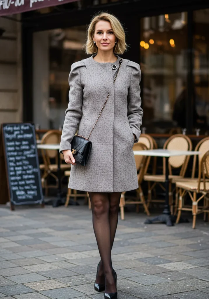 This polished outfit features a tailored gray wool dress coat styled with sheer tights, black heels, and a quilted crossbody bag. The streamlined silhouette gives it that timeless European elegance that’s impossible to ignore.