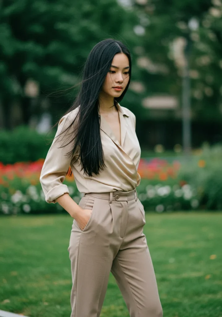 This sleek outfit combines a champagne satin blouse with tailored beige trousers, creating a polished monochrome moment that feels sophisticated but soft. The silky fabric catches the light beautifully, giving the whole look an elegant, effortless shine.