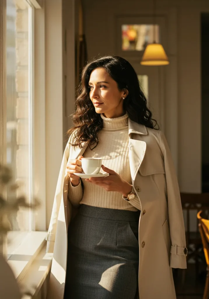 This refined look features a ribbed cream turtleneck tucked into a high-waisted charcoal pencil skirt, with a beige trench draped over the shoulders. The combination of knits and structure gives it a classic, city-chic vibe.