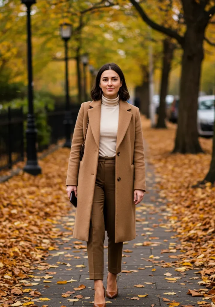 This outfit showcases a camel wool coat layered over a cream turtleneck and tailored tan trousers. The coordinating tones make the entire look cohesive, and the clean silhouette gives it that effortlessly elegant feel.