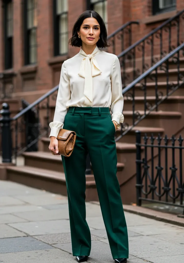 This polished combination features a cream bow-tie blouse tucked into tailored dark green trousers. A tan clutch and black pointed heels keep the look sophisticated and balanced. The outfit feels classic yet bold thanks to the rich color contrast.