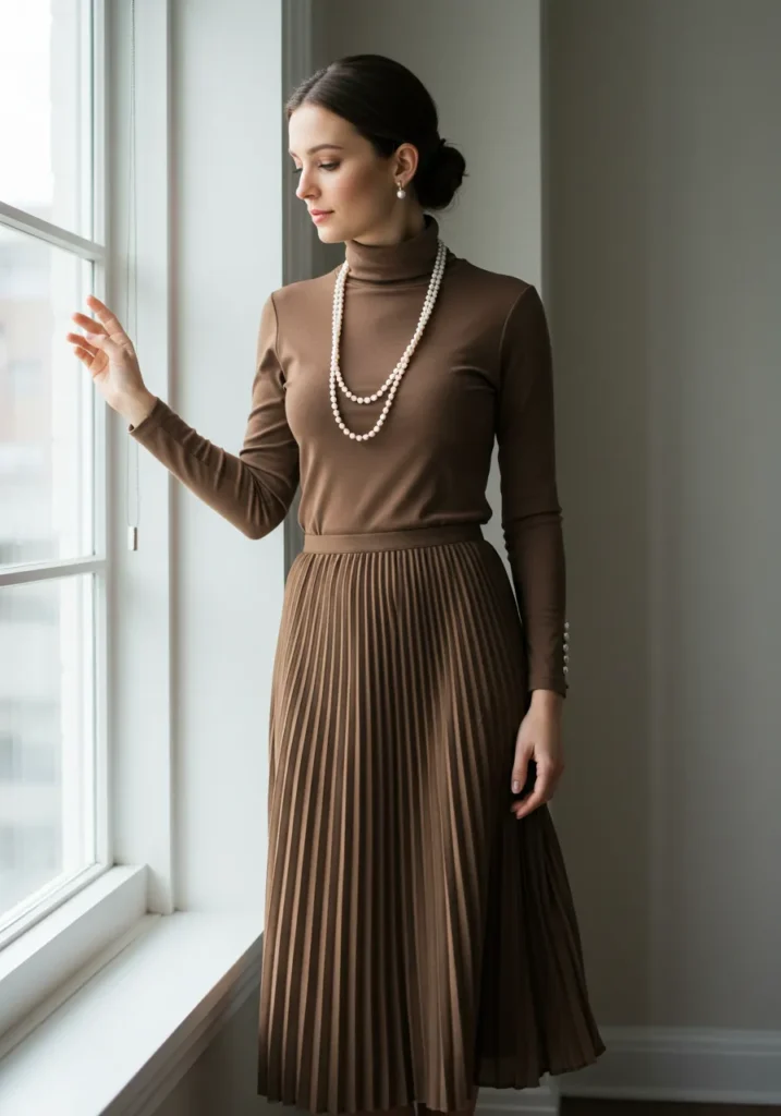 This elegant ensemble features a brown pleated midi skirt paired with a fitted brown turtleneck. A long string of pearls adds vintage charm, and the monochrome palette gives a modern, cohesive feel.