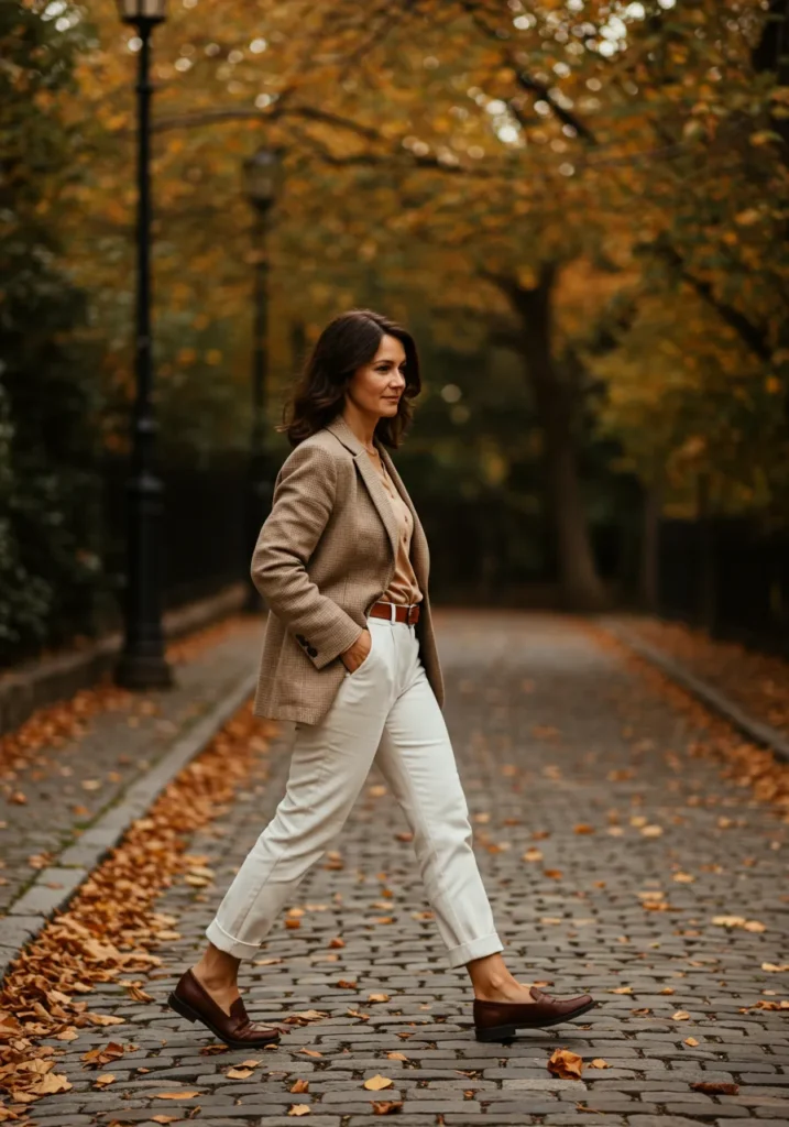 This look mixes casual sophistication with fall charm. A checked tan blazer is layered over a soft beige top, paired with crisp white trousers and brown loafers. The warm tones tie everything together for an effortlessly stylish vibe.