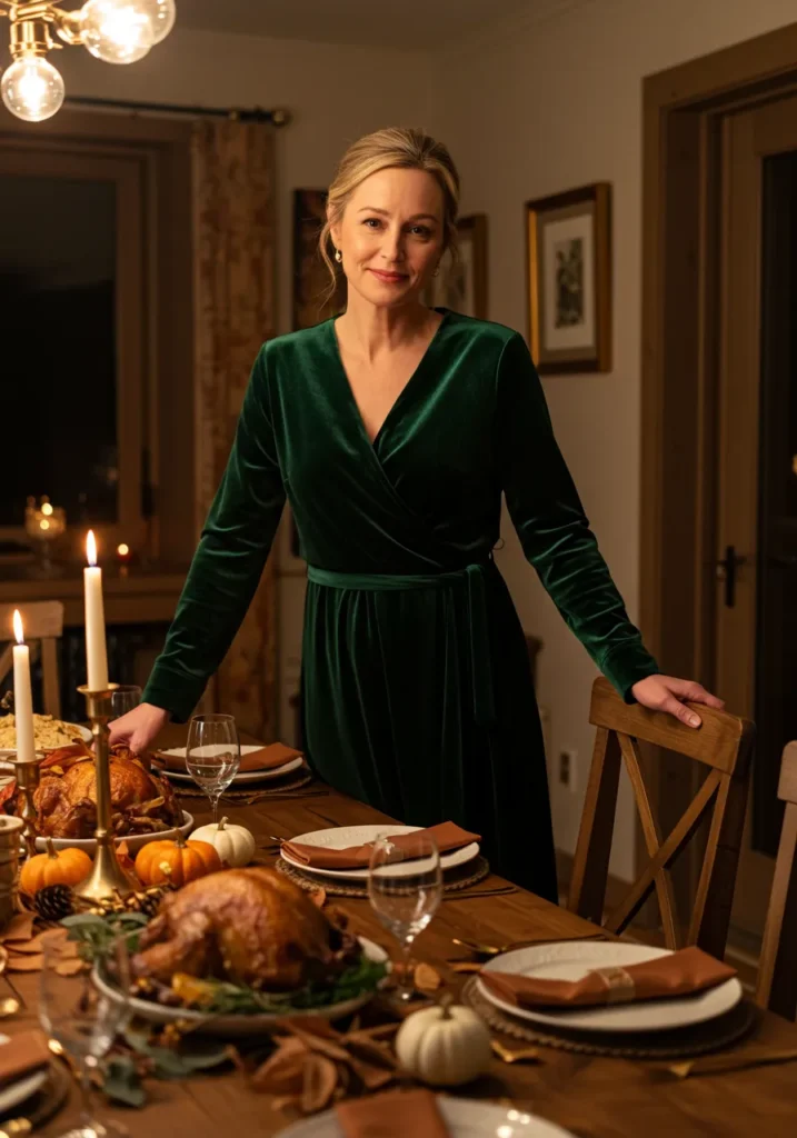 I love how this dress makes a statement without being loud. The color feels warm and romantic, and the silhouette gives that old-school charm that works beautifully for a Thanksgiving dinner or evening event. It’s simple, chic, and makes you feel instantly polished.