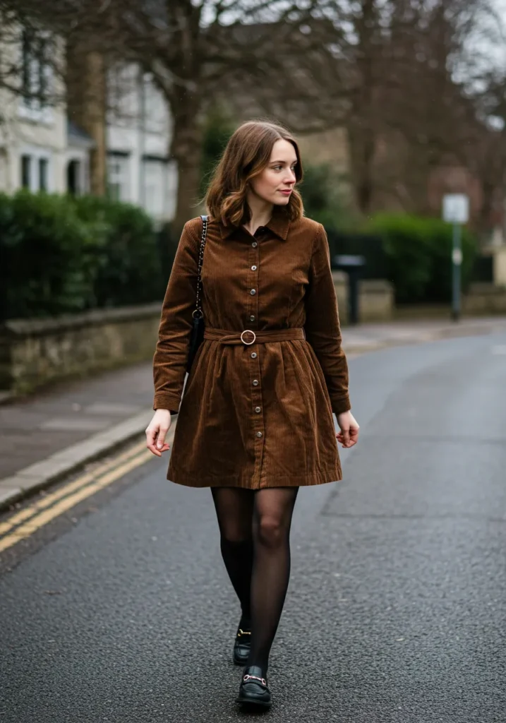 This chocolate brown corduroy dress brings together comfort and retro charm. The belted waist and button-down front give it a tailored yet casual feel, while the soft corduroy texture adds warmth and personality. Worn with tights and loafers, it feels playful but still put together.