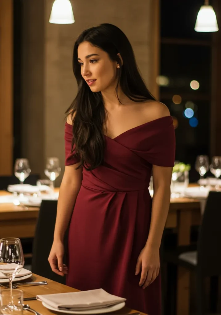 This off-shoulder burgundy dress has a romantic, refined feel. The folded neckline drapes beautifully across the shoulders, and the fitted bodice creates a flattering hourglass shape. The rich wine color feels bold yet classy, perfect for an evening Thanksgiving dinner.