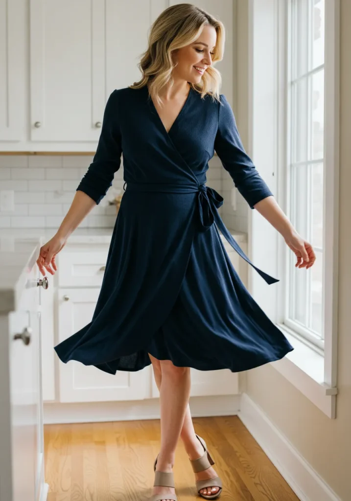 This navy wrap dress blends comfort and elegance so seamlessly. The soft, stretchy fabric moves easily, and the tie at the waist accentuates the figure perfectly. The mid-length skirt and three-quarter sleeves make it feel modest yet modern.