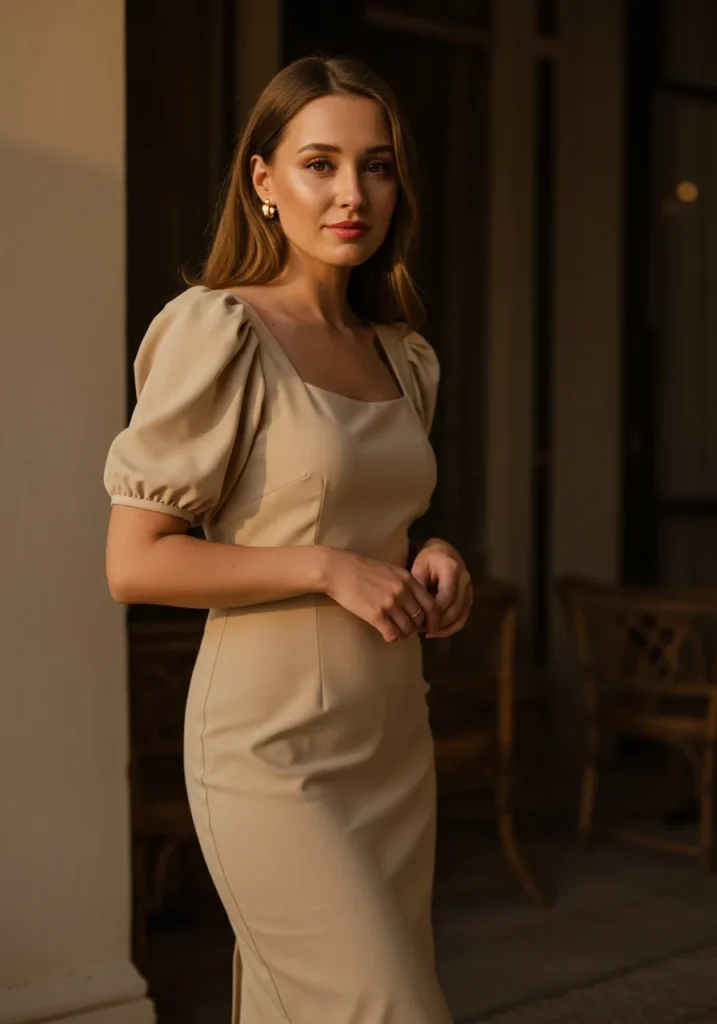 This beige puff sleeve dress gives off a soft, timeless charm. The structured fabric keeps its shape beautifully, and the square neckline adds a modern twist to the classic silhouette. The subtle tailoring around the waist flatters the figure while the short puff sleeves bring a touch of femininity that feels perfect for a Thanksgiving dinner setting.