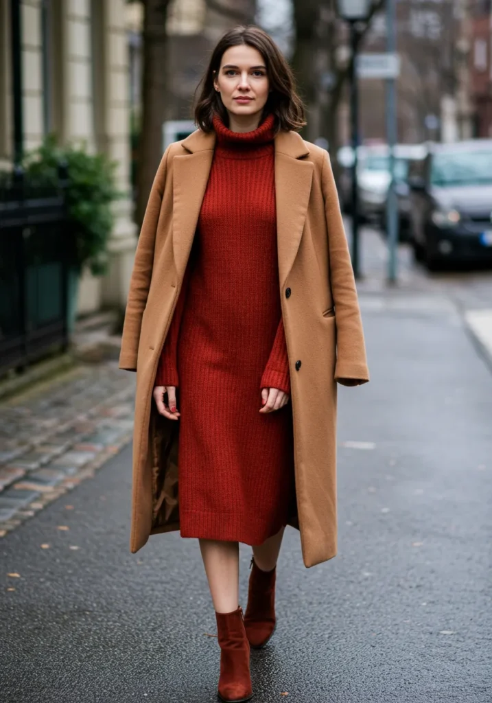 This rust knit dress paired with a camel coat is autumn elegance at its best. The ribbed texture of the dress gives it cozy appeal, while the turtleneck adds a refined touch. The camel coat draped over the shoulders complements the warm hue perfectly, and the matching ankle boots pull the whole outfit together.