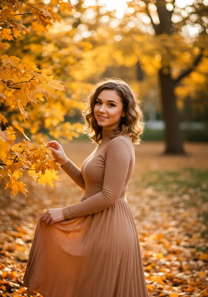 This light brown dress features a ribbed fitted top that flows into a soft pleated skirt. The high neckline and long sleeves make it elegant and weather-appropriate, while the lightweight fabric gives it movement and grace. It’s one of those outfits that feels both comfortable and dressy enough for a special occasion.