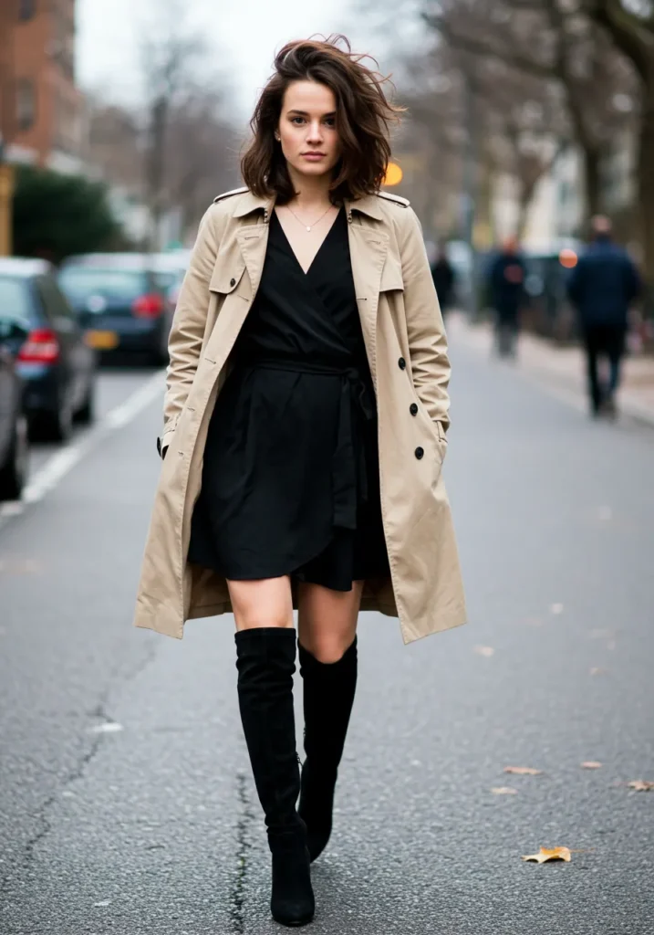 A black wrap dress paired with a beige trench coat never fails to make an impact. The short dress brings a flirty contrast to the structured outer layer, while the over-the-knee suede boots tie the whole look together. It’s stylish but practical, ideal for brisk fall weather and a city stroll before Thanksgiving brunch.