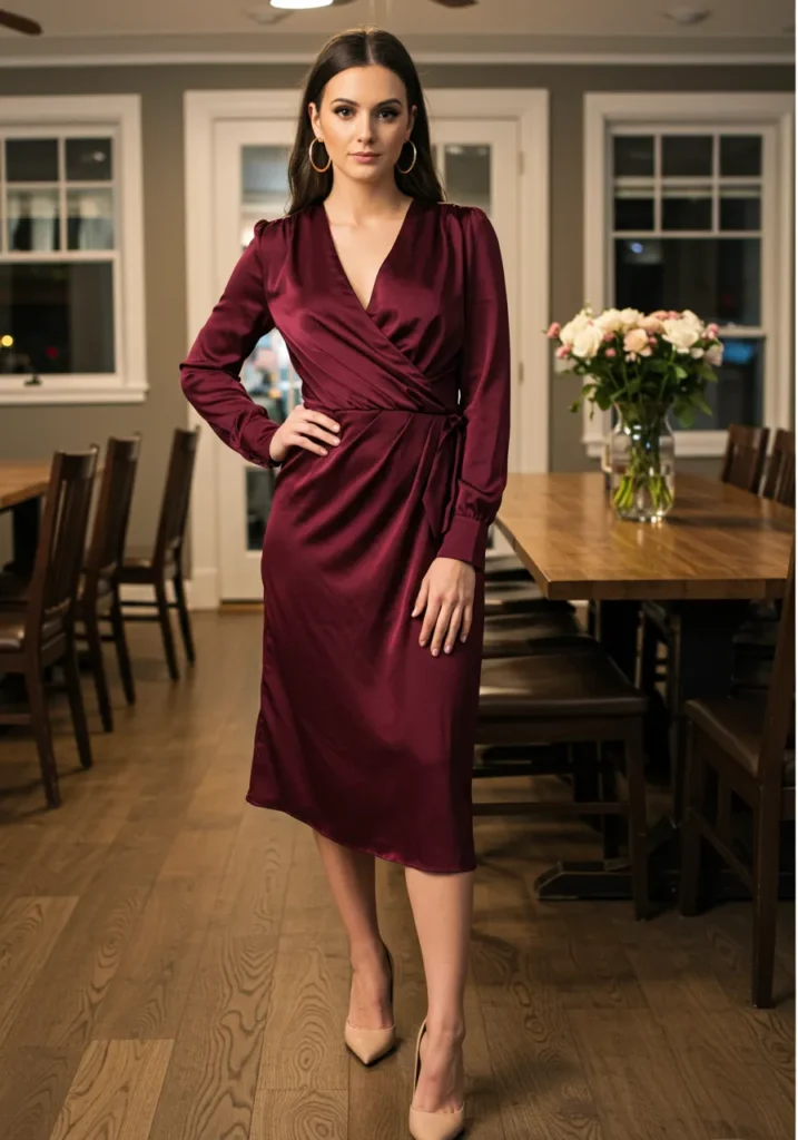 This deep burgundy wrap dress makes a stunning statement. The silky fabric and side tie detail create a flattering, feminine silhouette, while the long sleeves keep it elegant and season-appropriate. The slight sheen of the material gives it just enough glamour for a holiday gathering.