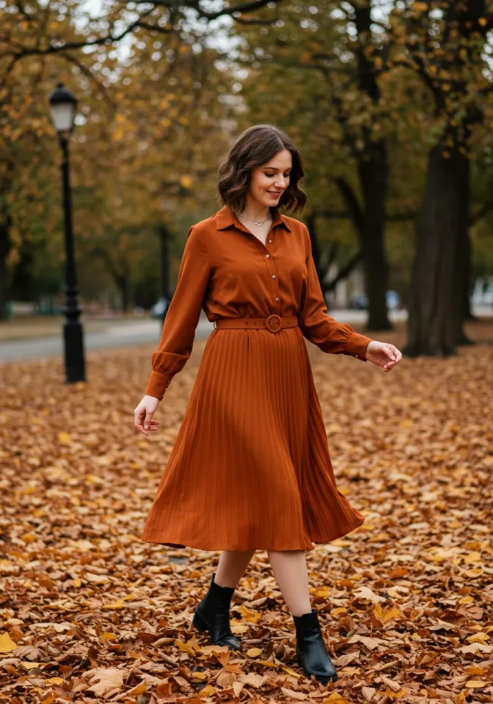 This rust-colored midi dress blends warmth and elegance effortlessly. The soft pleated skirt moves gracefully, while the belted waist defines the shape beautifully. The button-up top and cuffed sleeves add a touch of polish that feels both feminine and smart — especially paired with ankle boots for that cozy fall feel.