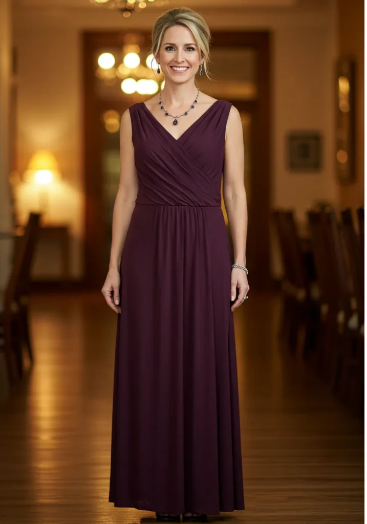 This sleeveless plum gown is pure sophistication. The wrap-style bodice creates soft lines across the torso, while the long flowing skirt adds an element of grace. Paired with delicate jewelry, it’s perfect for a formal Thanksgiving gathering or an evening where you just want to feel absolutely radiant.