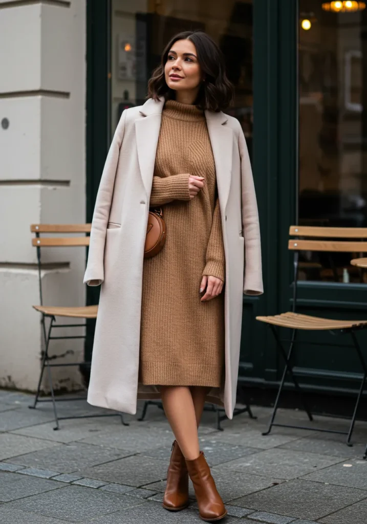This outfit nails cozy elegance. A ribbed camel sweater dress sits beneath a light beige long coat, finished with brown ankle boots and a small crossbody bag. The neutral tones create a soft, harmonious palette that feels refined yet warm — exactly the vibe for a chic Thanksgiving outing.