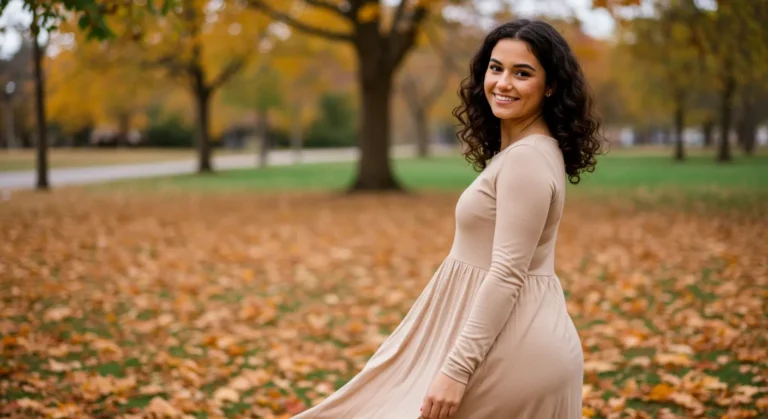 I love how flattering this silhouette is. It hugs just enough at the top before floating away gently, which always makes me feel confident and comfortable. The color blends so naturally with fall scenery, making it perfect for Thanksgiving photos and festivities.