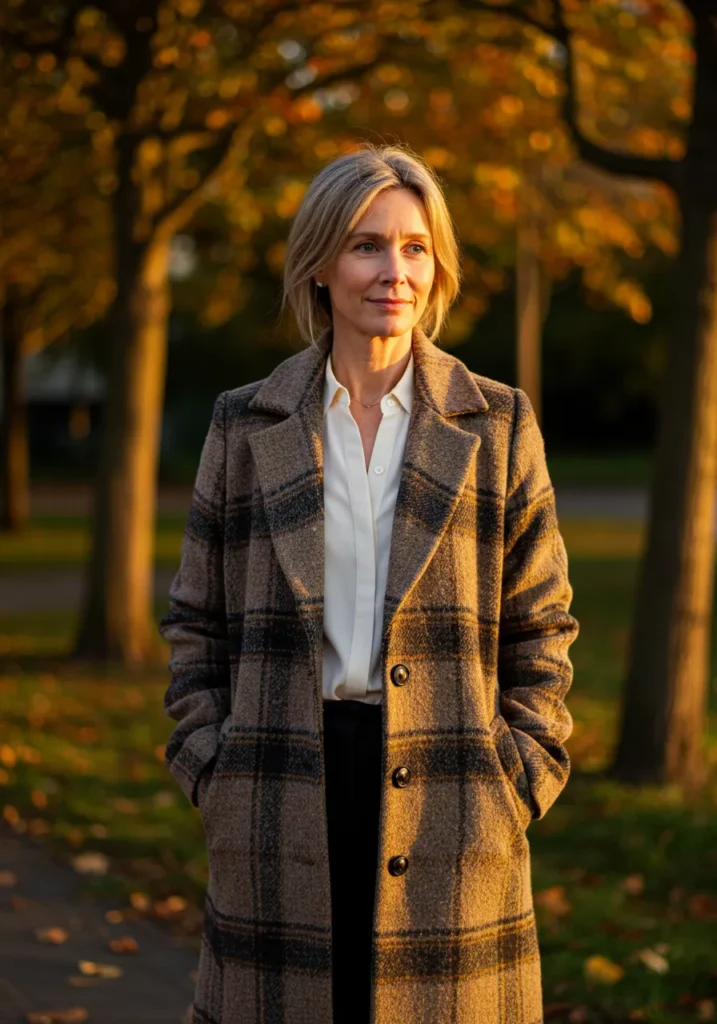 This outfit features a warm plaid wool coat layered over a crisp white blouse and tailored dark trousers. The coat’s soft texture and earthy tones create a relaxed fall vibe that feels both polished and approachable. The gentle golden hour lighting enhances the rich fabric, making the whole look feel effortlessly classic.